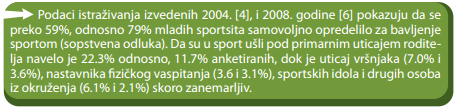 slika_1Neposredno pred polazak u školu (oko pete godine) budi se dečije interesovanje za sport, a najmasovniji ulazak u svet sporta dešava se u ranom osnovnoškolskom uzrastu. Iako najveći procenat naše dece izjavljuje da su se samostalno odlučili za bavljenje sportom ili na direktno insistiranje njihovih roditelja, ipak to znači da je njihova odluka o uključivanju u sport sazrela i donešena pod generalnim uticajem porodice i roditelja koji imaju pozitivan stav prema sportu, koji prepoznaju i cene njegove vaspitne potencijale i koji sopstvenim aktivnim sportskim životom služe kao najbolji promoteri njegovih vrednosti.