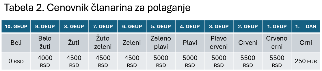 Cenovnik za POLAGANJE je dat u tabeli. (klikni za veću sliku)