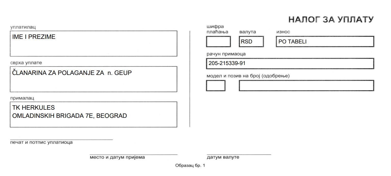 Uplata se vrši u gotovini u prostorijama kluba po tabeli. Ili na racun kluba